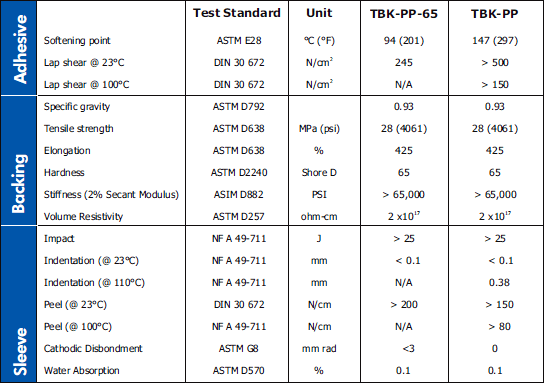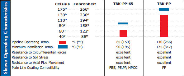Canusa-CPS offers a range of TBK-PP products designed for pipeline operating temperatures up to 130°C (266°F). The system is fully compatible with cathodic protection systems, resists cathodic disbondment, and is designed for a wide range of operating temperatures.