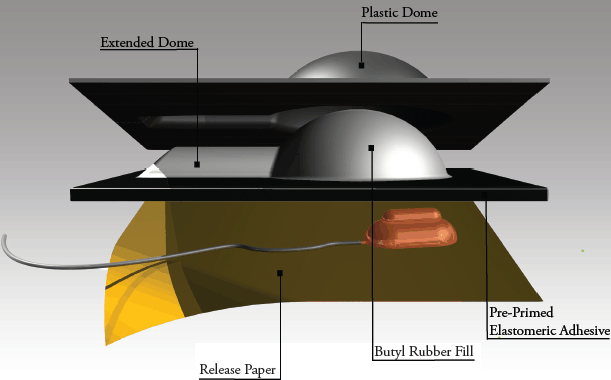 Molded plastic dome filled with corrosion resistant compound on a base of thick elastomeric tape.