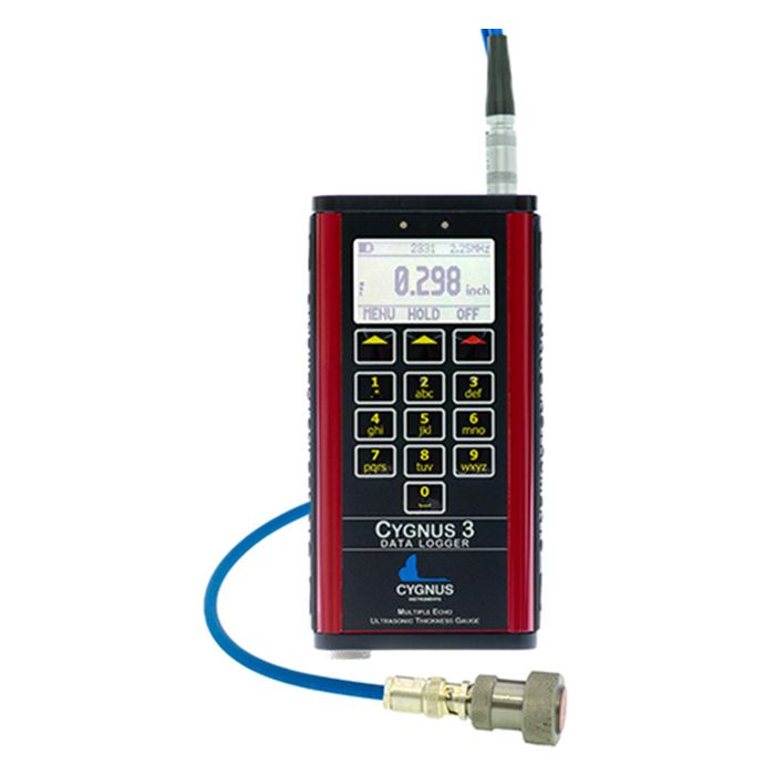 Ultrasonic hand-held digital thickness data logs up to 200,000 points, is easy to use, and interfaces to a PC using Windows software.