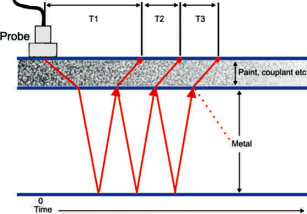 With multiple echo technology, readings are taken by measuring the time delay between any three consecutive backwall echoes. The time T1 (for coating thickness) is ignored. The times T2 and T3 are equal to the time that it takes for sound to travel through the metal. Only by looking at three echoes can the measurements be made for the metal thickness, where T2 = T3.