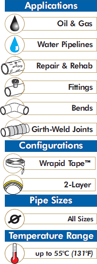 Saves Time & Money: Wrapid Tape™ is quick and easy to install. Since no special priming or operator equipment is required, product installation is quick and labor costs are kept to a minimum. Unlike conventional cold-applied tapes, Wrapid Tape™ does not require the use of high volatile primers, further minimizing costs and risks to health and safety.
